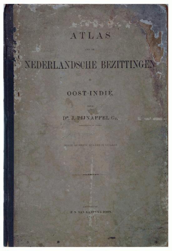 Atlas van de Nederlandsche Bezittingen in Oost Indie, Derde op Nieuw Bewerkte uitgave. 1884. By Dr. J. Pij. N Apple Gz. 9 Lithographer col. maps size: 52x42cm Amsterdam P.N van Kampen & zoon. Poor cover