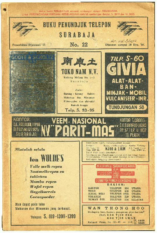 Buku Petundjuk Telepon Surabaja No.22-1957. By G. Kolff & co. 282pp w. many advertism format 27,5x18,5cm.