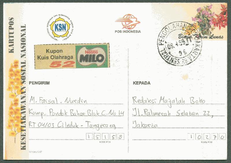 Cap "SENTRAL PENGOLAHANPOS JAKARTA08.4.99" |