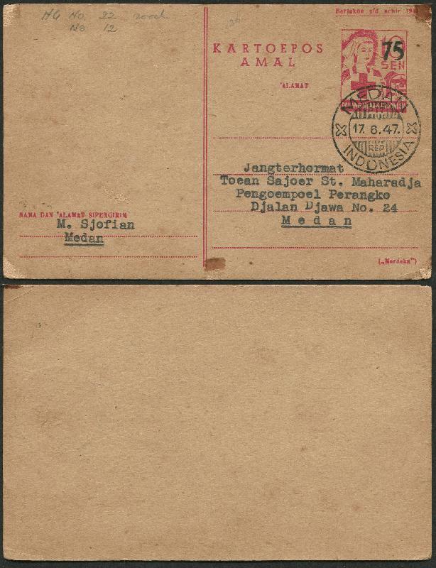 Postcard 'Amal CT 75 SEN' SK-A7b (red), pmk "Medan Indonesia 17.6.47", sent locally Medan. VERY RARE ITEM, Good Condition